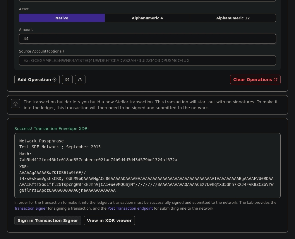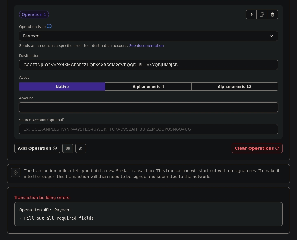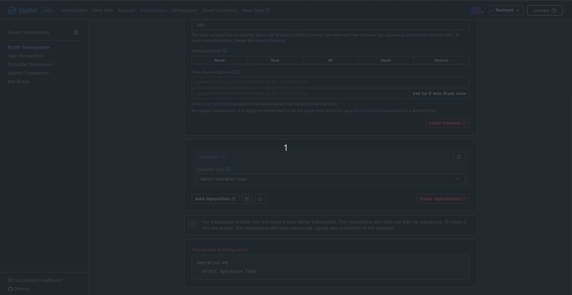 If you go a little lower you’ll also see that the Lab automatically warns you if there’s any missing field or if your operations are ready to go, but performing the transaction build automatically