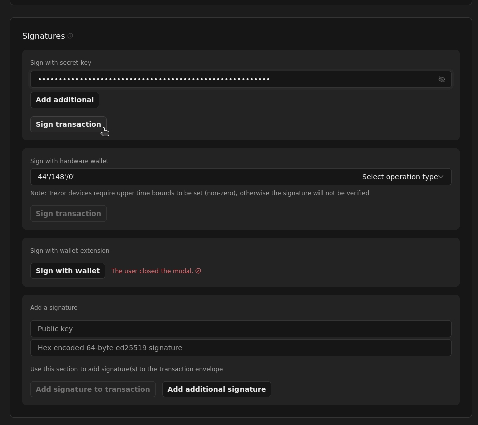 In the following section you’ll be able to add your signature, sign with a hardware wallet or use your preferred extension wallet and add as many signatures as your transaction requires