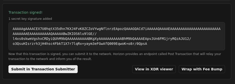 Don’t forget to use the Sign transaction button to actually sign your transaction, which will generate a new XDR for a signed transaction at the bottom of this section