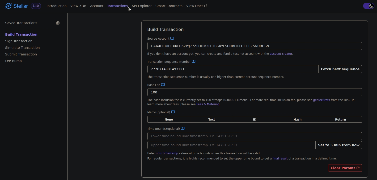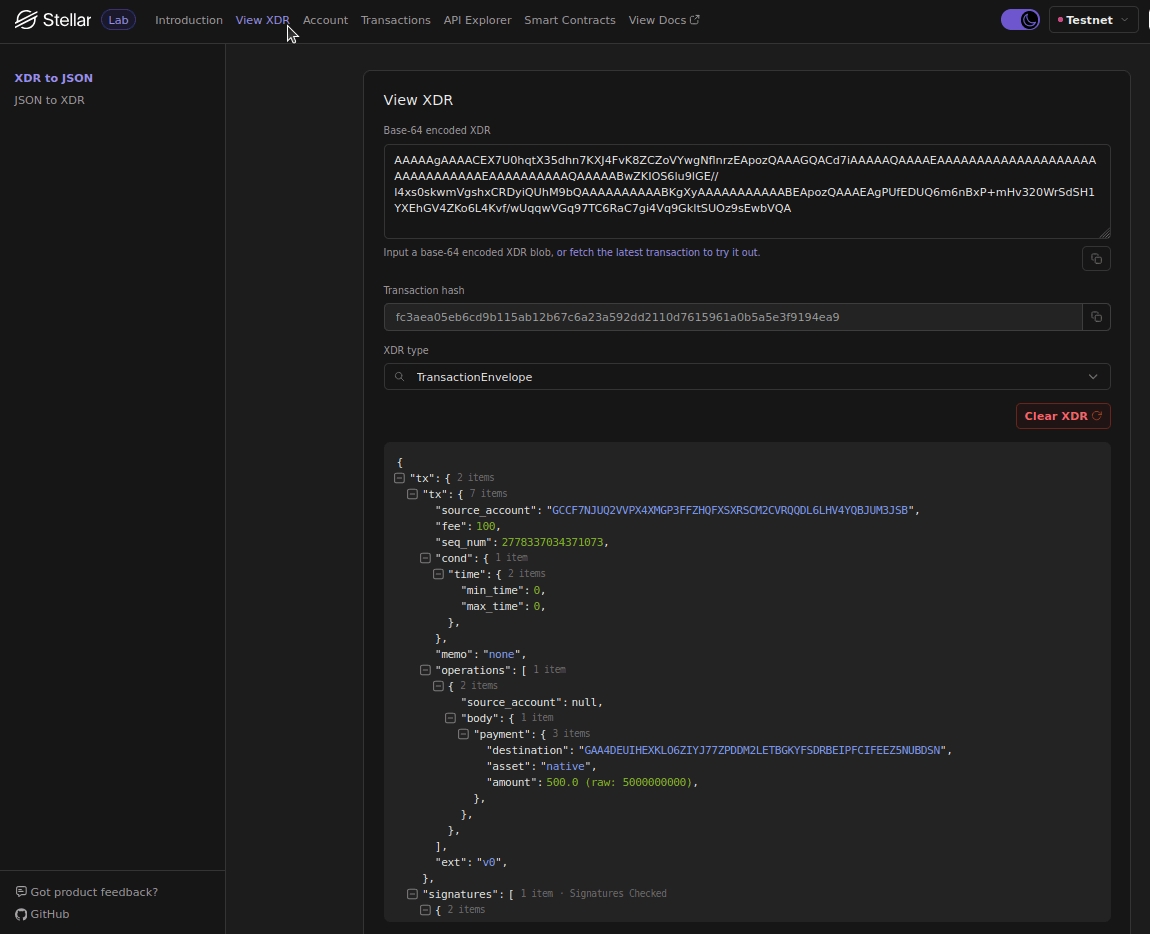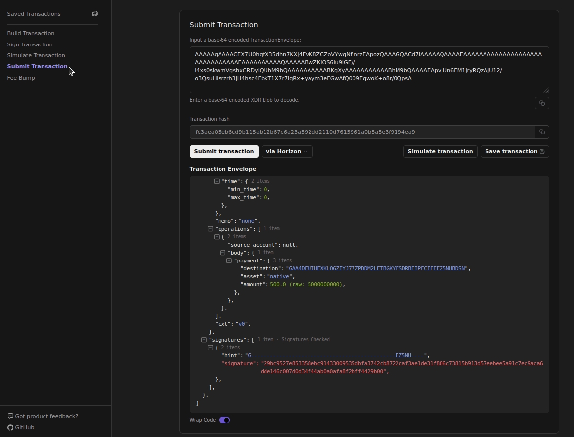 The lab will provide you with a detailed view of your transaction and once you use the Submit Transaction it will submit it to Stellar Network via Horizon or RPC and you’ll see its result just as if you were using code to submit it in your app.
