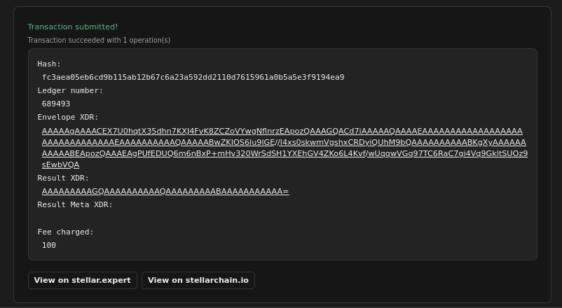 If everything went fine in a couple seconds you’ll see your transaction result with a Transaction submitted! Alert and its Hash, Ledger number, Envelope XDR, Result XDR and Fee charged