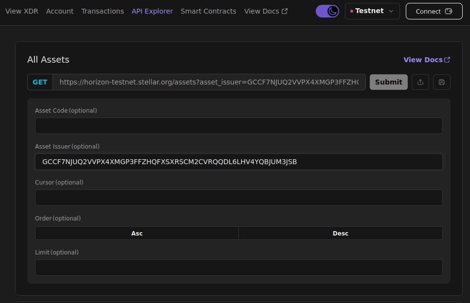 Many of the consults you’ll wanna make while working on Stellar will be available in this section, from account balances to trade offers or fee stats and it will also allow you to perform some actions, such as sending or simulating a transaction . Each one of the endpoints listed will provide you with clear fields to perform your desired query, and once you fill the form you will also se on the top the exact request to Stellar Network to fetch your results.