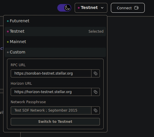 First thing you’ll need to do when working in the lab is making sure you’re using the exact network you intend. Stellar LAb offers you the possibility to work on all of the Stellar Networks but also to connect to your own custom network if you decide to run Stellar on you own using it’s provided image stellar/quickstart