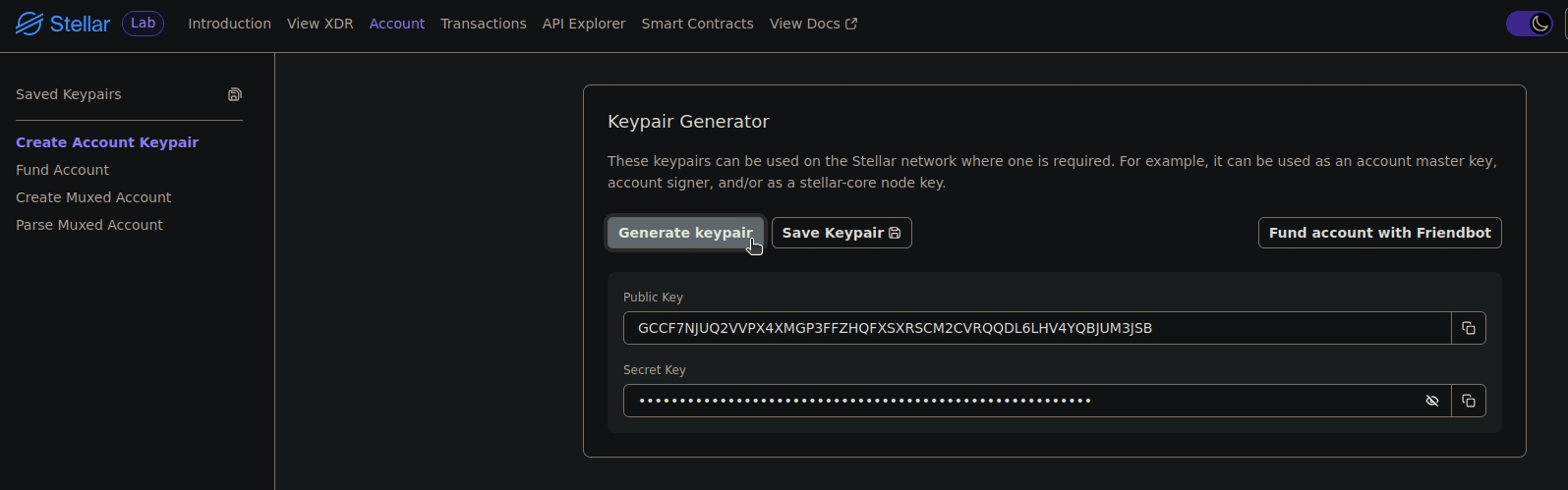 In the option Create Account Keypair Stellar will provide you with a brand new set of keys. Now, keep in mind that only Keypair does not make a Stellar account, so you’ll need to fund them to actually be able to use them.