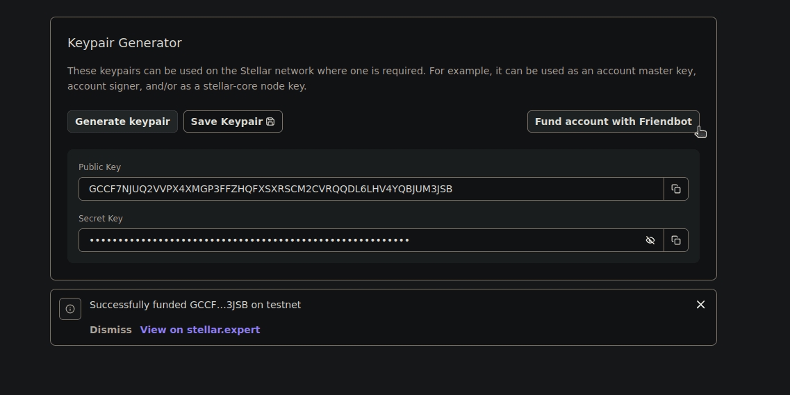 If you’re in production mode and are using the mainnet you can simply take this keypair and fund them with your preferred method. If you’ll be using it for testing you can simply fund them using Stellar’s friendbot. Simply use the ‘Fund account with Friendbot’ button at the top right, wait a couple of seconds and you’ll have a brand new funded account with 10,000 XLM ready to use.