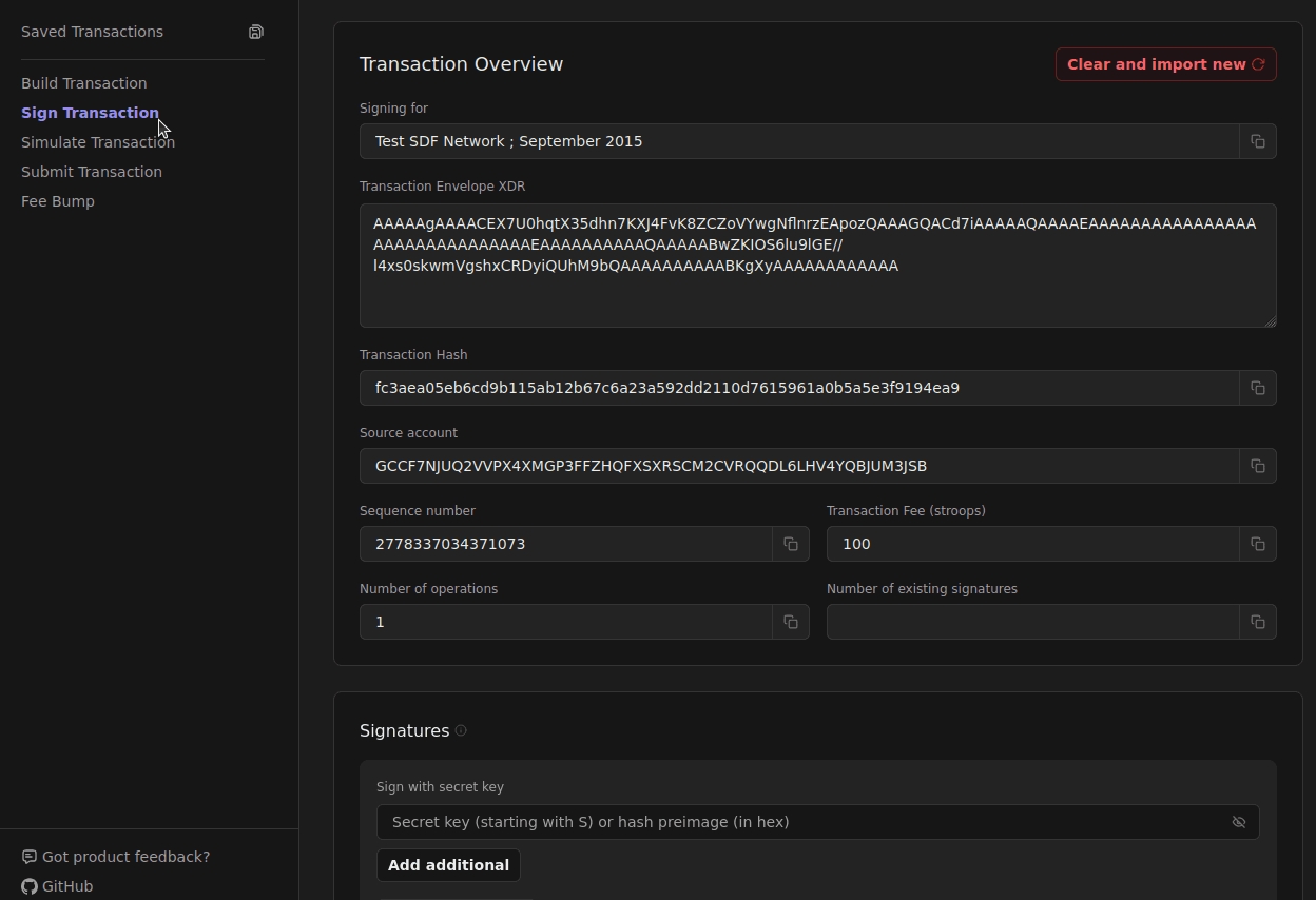Simply use the Clear and import new button and paste your XDR. In the fields above you’ll be able to check the transaction hash, the Source account, its Sequence number and its fee.